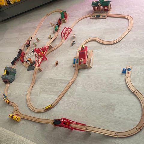 BRIOn ja muiden yhteensopivien merkkien puinen junaratasetti. Setti sisältää paljon erilaisia radan osia, junavaunuja, siltoja ja rakennuksia. Junaradan materiaali on puuta ja osa setin osista on muovia.