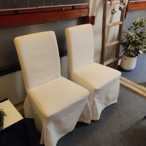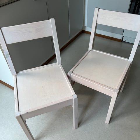 Istuinosa ja selkänoja keinonahkaa. Selkänojan kork. 55 cm. Tuoli on 2 kpl. 10 €/ kpl.