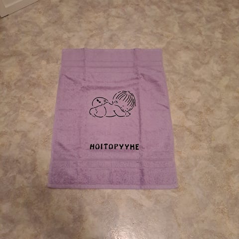 Uusi ruskea 50x70cm pyyhe, käsinpainettu nalle kuva ja hoitopyyhe teksti.