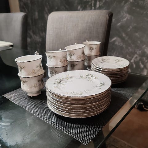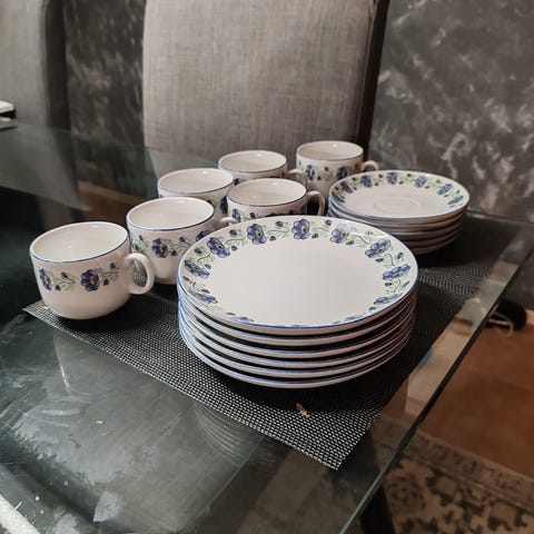 Sisältää kahvikupit ja lautaset, kakkulautaset, syvät lautaset ja matalat ruokalautaset.