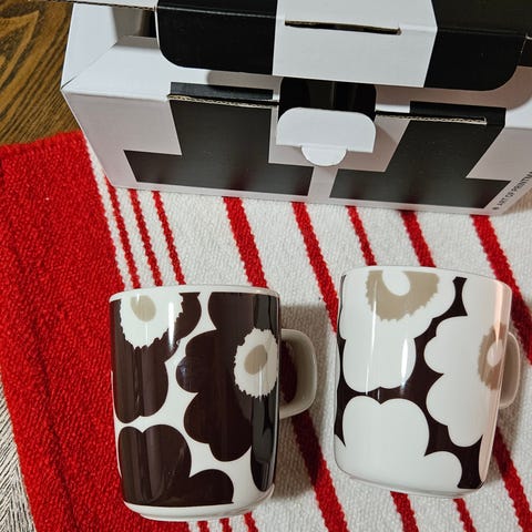 Marimekko Oiva kahvimukit, 6 kappaletta. Sopii astianpesukoneeseen, mikroaaltouuniin ja pakastimeen. Kunto hyvä, muutamassa mukissa pohjassa jälkiä mutta varmaan saa puhdistettua pois oikeilla aineilla.