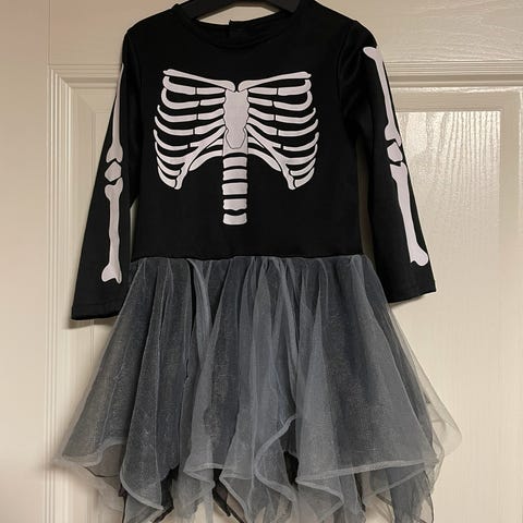 Lasten luurankoasu, koko 110. Polyesteriä, sellaista "liukasta", ei siis neulottua. Luuranko ei hoida pimeässä.