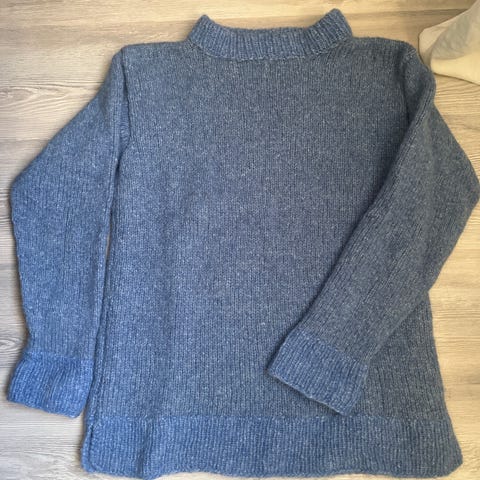 Käsin neulottu laadukkaasta alpakka-merino langasta. Käsityötä, mutta erittäin siisti jälki. Säilytyksestä vähän ryppyä, mutta höyryttämällä saa sileäksi. Ihana pieni pysty kaulus (savupiippu) ja raglanhihat. Koko XS/S, mitat kuvissa.