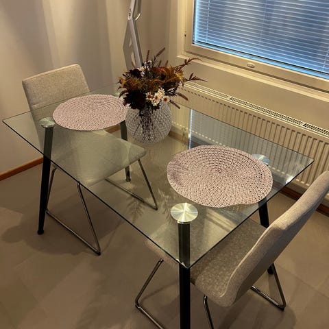 Hyväkuntoinen ruokailupöytä ja neljä valkoista Mayfair tuolia. Pöydän pinta on irrallinen vahvistettu lasi, joka asetetaan metallirungon päälle. Ollut tavallisessa käytössä eikä siinä ole kolhuja tai vekkejä. Tuolit ovat olleet aktiivisessa käytössä, päälliset ovat kuitenkin ehjät. Tuotteet on ostettu aikanaan stemmasta. Lisäinfoa viestillä.