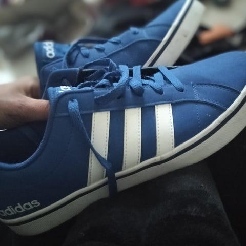 Valkoiset tennarit on kokoa 42. Nämä on muuten siistissä kunnossa, mutta oikeasta kengästä päkiän kohdalta sauma oli vähän auki ja se korjattu vahvalla pikaliimalla ja on siitä kohdin nyt vähän kovempi. (Katso kuva)