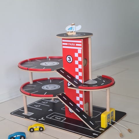 Puuauto ja puinen nosturiauto ja kettu joka heiluttaa häntää.Nouto Hämeenlinnasta.