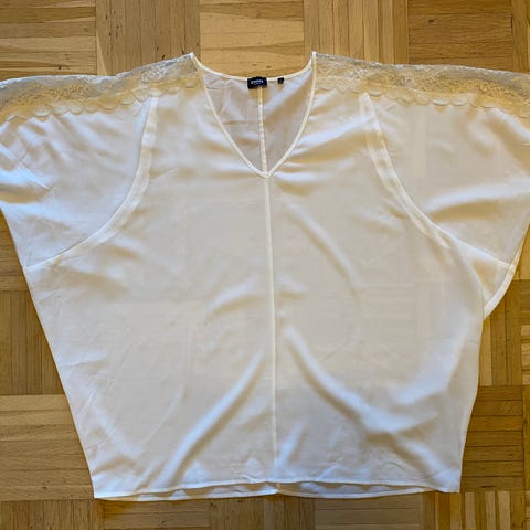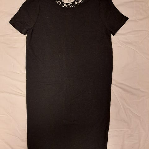 Myydään kuvan Emme-mekko, koko vastaa L-kokoa. Pitsimäistä kangasta, kuten kuvassa vasemmalla olemassa hihassa vähän heijastuu läpi. Vartalo-osassa toinen puuvillakerros alla, joten mitään ei näy läpi.