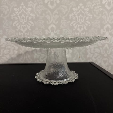 Käsin tehty näyttävä tarjoilualusta täytekakuille ja muille herkuille. Lasin värinen jalka.