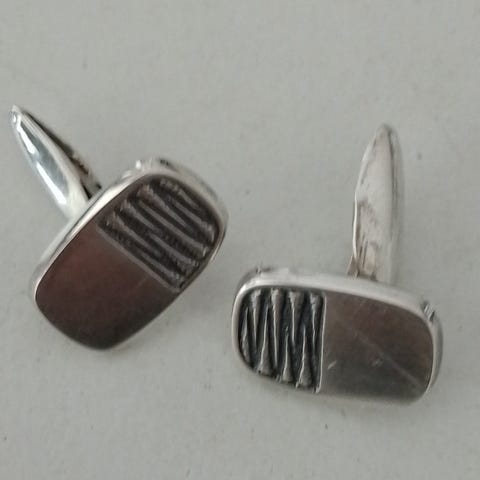 Miesten hienot vintage hopeiset kalvosinnapit. Ei kaiverruksia tai nimikirjaimia. Leimat K-H Oy, kruunuleima, 813H, Turun kaupunkileima sekä vuosileima L7= 1964 Paino 10,4 g
