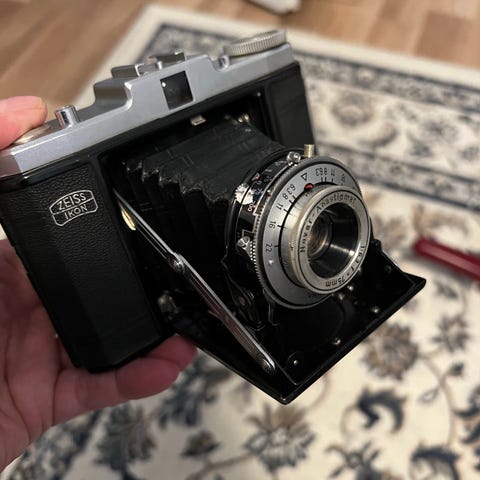 - mukaan kamera, ruskea nahka laukku, kameran sisällä oleva filmi ja sekä pöytäteline että puinen käsikahva