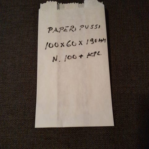 Toiseisessa ilmoituksessa kahdenkokoisia paperipusseja.
