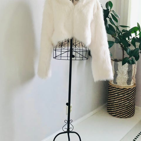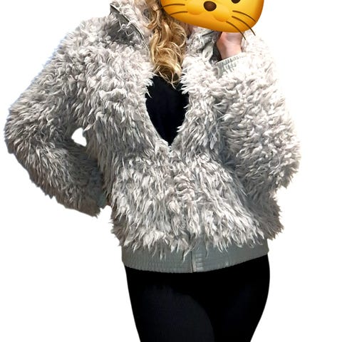 Karvatakki koko 38. Yksi pidike irronnut ja korvattu hakaneulalla, mutta ei oikein näy karvojen takia (kakkoskuva).