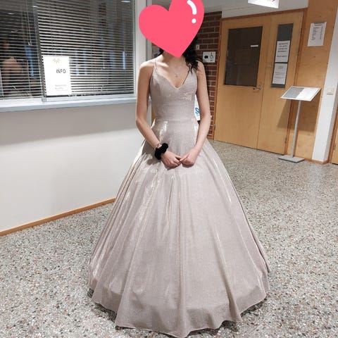 Mekkoa ei ole lyhennetty/kavennettu. Oon 176cm ja tanssin tennareilla. Kuvissa alla vannehame. Kimaltaa upeasti valoissa, väri shampanja