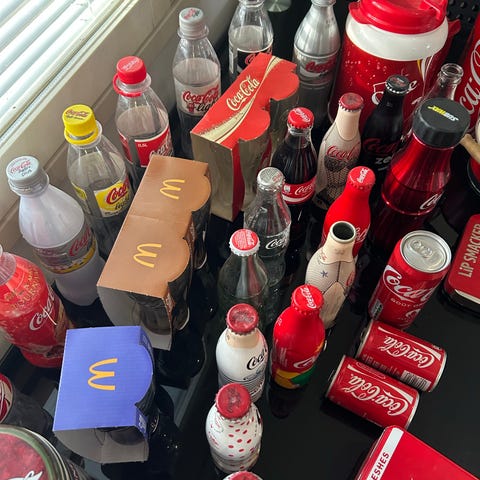 Kuusi lasista, ranskalaista 250 ml Coca-Cola pulloa + pahvinen kantoteline