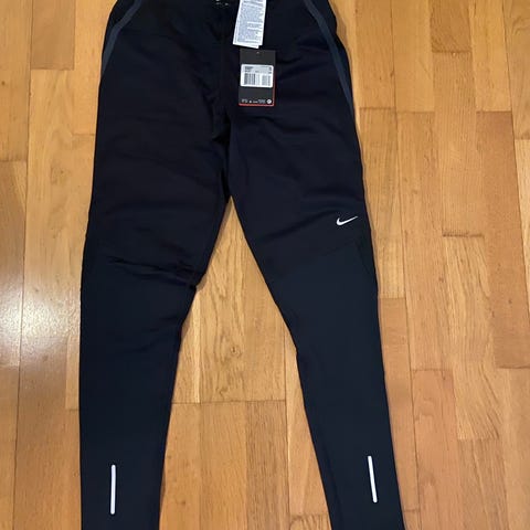 Nike Dry Fit-juoksuhousut, koko S (vastaa mielestäni paremmin XS). Housuissa tiukat resorit vyötäröllä ja lahkeissa. Taskut molemmilla puolilla.