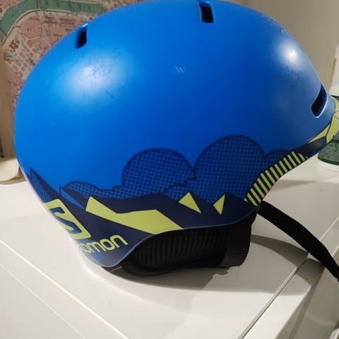 Musta Salomonin lasten laskettelukypärä, koko S (53–56 cm). Kypärä on hyvässä kunnossa, pinnassa vain pieniä käytön jälkiä. Pidetty siististi — ei tiputeltu tai kolhittu.