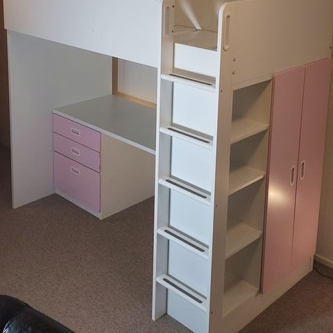 Myydään Ikean valkoinen parvisänky stuva. Kunto on suurimmaksi osaksi hyvä, mutta sängyn hyllyn sisäseinässä on pieni vaurio (kuvassa näkyvä lommo/lohkeama). Sängyn mukana tulee 90x200cm kokoinen patja muttei muita kuvissa näkyviä tavaroita. Patjassa on pieni sinitarratahra joka ei ole ollut haitaksi käytössä.