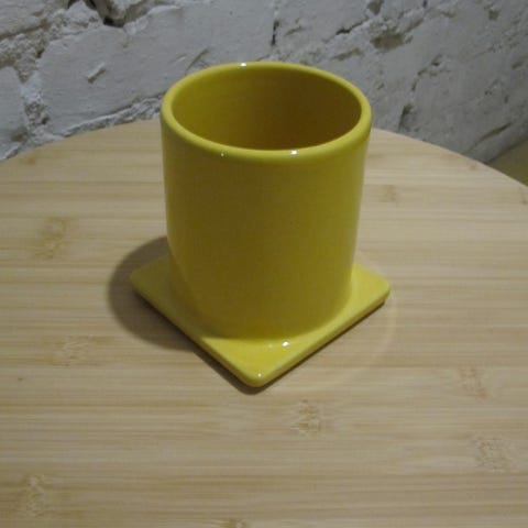 Purkki ilman kantta. Kuten kuvista näkyy sopii moneen eri asentoon. Korkeus 18 cm, leveys 17 cm ja sivujen leveys 13 cm. Suuaukon halkaisija 9cm