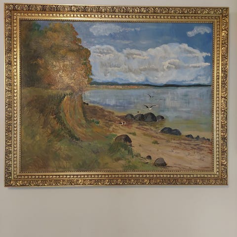 Maisemamaalaus, jossa on syksyinen metsä ja joki. Teoksessa näkyy puut, virtaava vesi ja taustalla kaukana näkyvät kukkulat. Maalaus on kehystetty puisella kehyksellä.Taulun korkeus 69cm ja leveys 90cm.vain nouto.