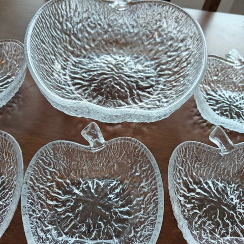 6 omena-jälkiruokakulhoa ja tarjoiluastia. Vain nouto.
