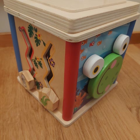 Avattu ja kertaalleen leikitty puinen lelu numeroiden opettelua varten.