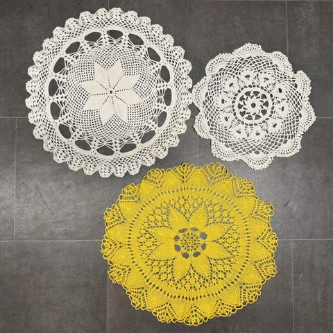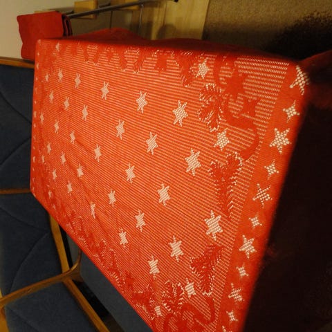 Jouluaiheinen valkoinen pitsiliina. Kuviot: tähti, kynttiät ja joulukellot. Koko n. 80 x 78 cm. Materiaali: 100% polyesteri. Punainen jouluinen pitsikaitaliina. Mitat: pituus 80 x 36 cm. Valmistettu teollisesti.