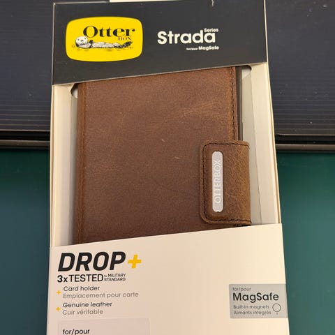 Otterbox Strada suojakotelo IPhone 14 pro. Sisällä olevan etummaisen taskun reuna hiukan venynyt ja kehys jonkun verran löystynyt. Ilmenee lähinnä niin, että laturi ei aina osu suoraan kohdilleen kun kehys voi olla vähän vinossa. Kiinnike toimii ja yleisilme hyvin siisti.