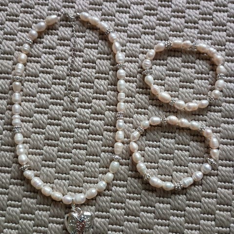 Korusetti sisältää kaulakorun ja rannekorun, joissa on vaaleanpunaisia helmiä. Kaulakorussa ja rannekorussa on koristeena tutti.