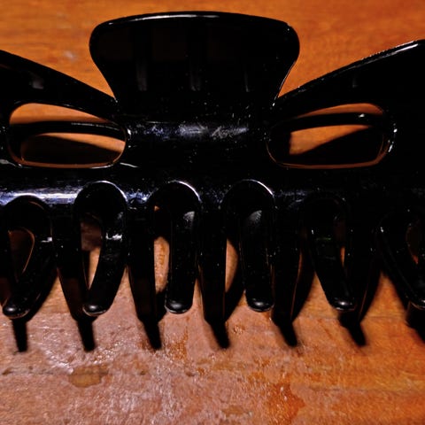 Harmaa iso klipsi jolla voi kiinniittää hiukset kätevävästi mm. meikkauksen ajaksi.