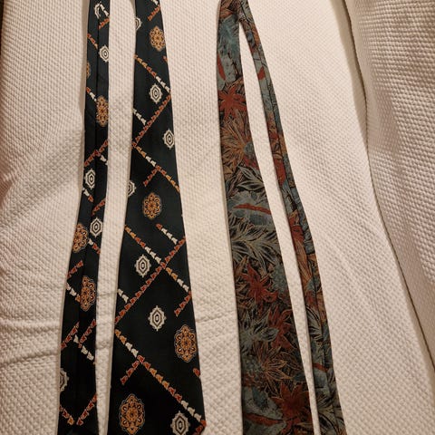 Kuvassa vasemmalla Greg Hunt sinipohjainen Seta-silkkisolmio. Pituus 150 cm leveys, max 9,00 cm cm. Hinta 15 eur.