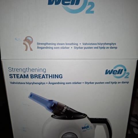 Täysin uusi Wello 2 hengitysharjoituslaite pakkauksessa. Ainoastaan osa laitteen osista on otettu tehtaan pusseista pois, mutta muuten käyttämätön.