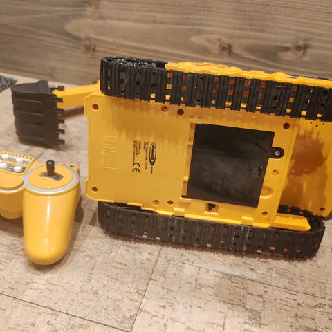 Radio-ohjattava kaivinkone. Akku voidaan ladata uudelleen. Akkupeite on kadonnut, yritän etsiä sitä - on löytynyt. 👍