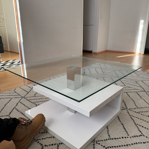 Ruskea sohvapöytä, lasikansi 58cm x 98cm