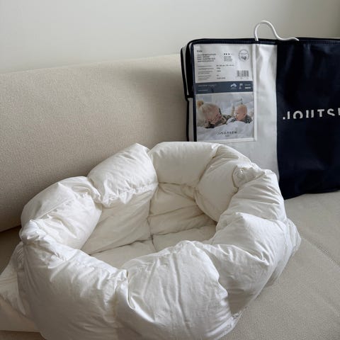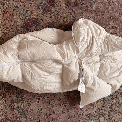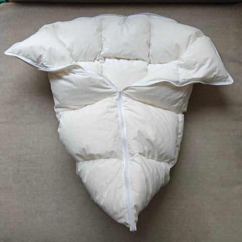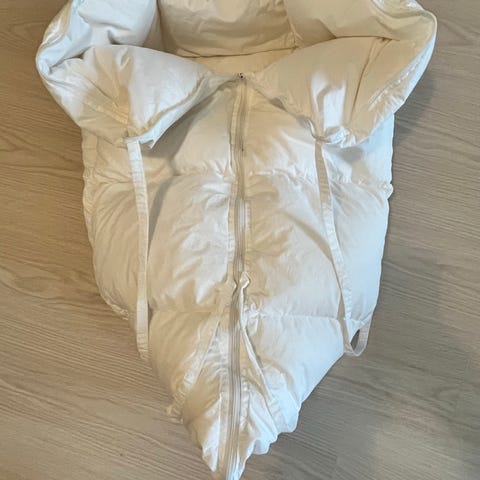 Lämmin vaaleansininen untuvamakuupussi mitta aukinaisena peittona noin 116cm x 86cm. Suurinpiirtein saman kokoinen kuin äitiysavustuspakkauksen makuupussi, mutta tämä on lämpimämpi.