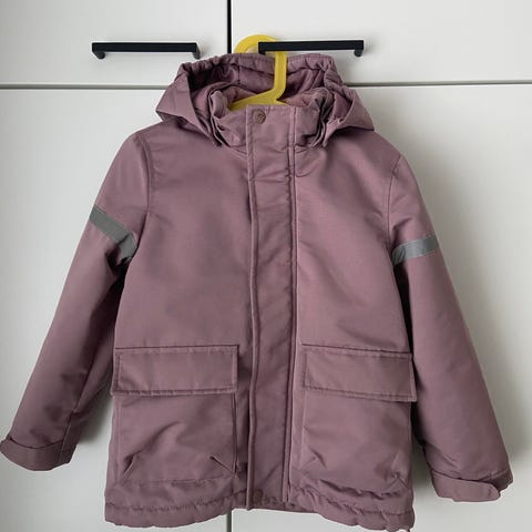 Lasten vaaleanpunainen talvitakki irroitetavalla hupulla, kokoa 110, H&M