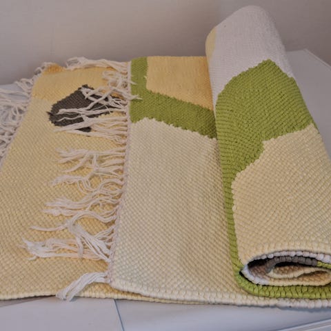 Pieni valkoinen matto, vaaleanharmaalla kuvioinnilla. Todella hyvässä kunnossa. Vasta pesty. Ei eläintalous.