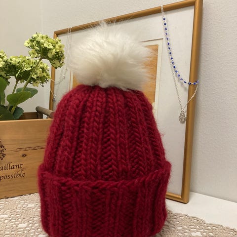 Villa (65%) alpakka (35%) sekoitelangasta neulottu pipo tupsulla. Pipon käänteessä läpinäkyvä kuminauhalanka estämässä lörpsähtämistä. Mahtuu aikuuseen päähän.