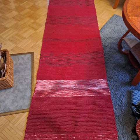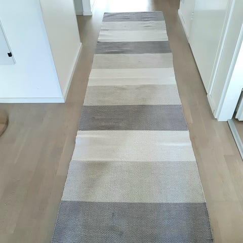 Suomessa kudottu puuvillaräsymatto on napakka ja ryhdikäs lattialla. Matto on ollut käytössä mökin vierasparvella, jossa se ei ole altistunut tahroille tai muulle likaantumiselle. Matosta on käytetty vain toista puolta, joten pesutarvetta ei ole vielä ollut.