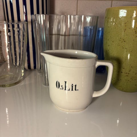 0,1 l mittakannu. Nokassa pientä kulumaa ja takaa puuttuu pieni pala.