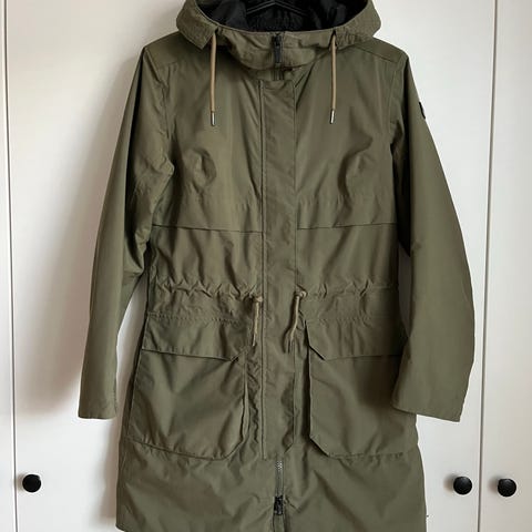 Helly Hansenin vaaleanvihreä Mayen parka. Kevyesti topattu. Pesty ja lämpöaktivoitu vedenpitäväksi/vettähylkiväksi. Huppuun kuuluu myös irrotettava karvareunus, joka ei näy kuvassa, mutta pakataan mukaan. Toisessa hihansuussa pienen pieni tahra, joka ei lähtenyt pesussa (katso toinen kuva). Aavistus kulumaa kyynärtaipeissa. Muuten todella siisti ja hyväkuntoinen.