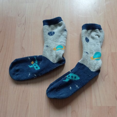 Kerhotossut Spiderman kankaasta. Etuosan kuvio on hologrammi, jossa kuva vaihtuu katsomissuunnasta riippuen. Käytetty vain kerran, koska lapsi päättikin ottaa toiset tossut päiväkotiin.
