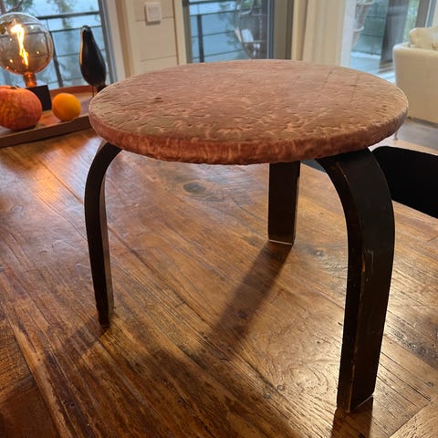 Retro jakkara, jossa on istuimessa punainen kernipäällyste. Valkoiseksi maalatut metallijalat.
