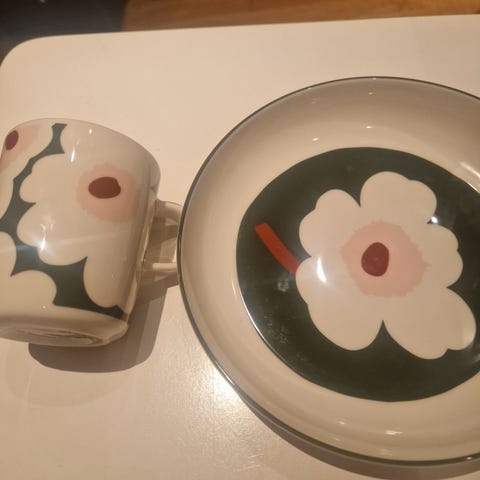 Myydään kuvassa olevat Marimekon mukit ja pastalautaset