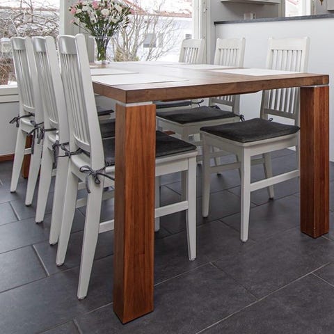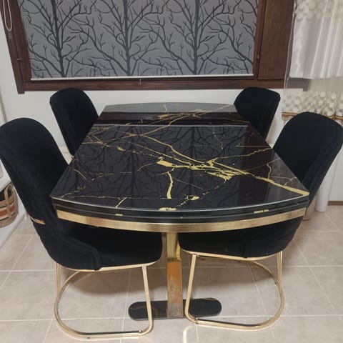Upea käsintehty lankkupöytä mustilla tukevilla metallijaloilla. Leveys noin 124 x 79cm. 4 vihreää Rowicon samettituolia, todella laadukkaat ja mukavat istua! Nouto Itkonniemi Kuopio.