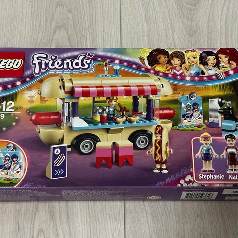 LEGO Friends 41129 Huvipuiston nakkisämpyläauto. Ohjeet mukana. Paketista puuttuu yksi musta palanen, katso kuvat. Mukana tulleet tarrat liimattu niihin kuuluviin palasiin. Hyväkuntoinen.