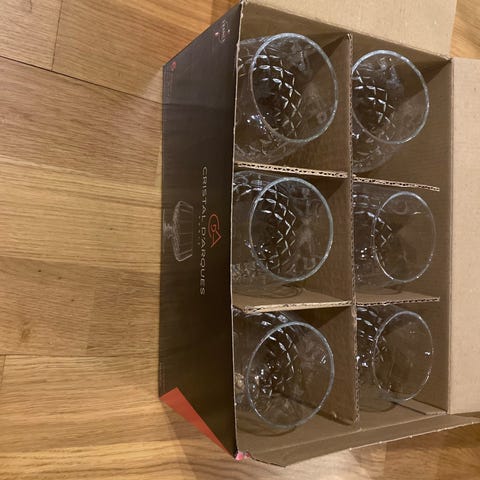 Kristalli viskilasit ja karahvi nyt tarjolla.
