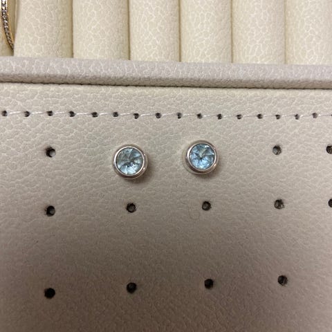Kalevala Lähde nappikorvakorut. Korvakorut on valmistettu hopeasta ja niissä on vaaleansinen topaasi koristeena.