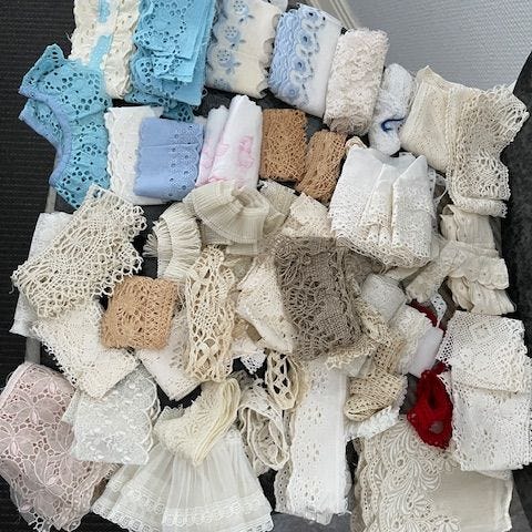 Erilaisia pitsinauhoja ja ompelutarvikkeita