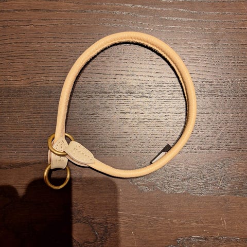 Onega puolikiristävä pyöristetty nahkapanta ketjulla. Koko 8mm x 37cm.