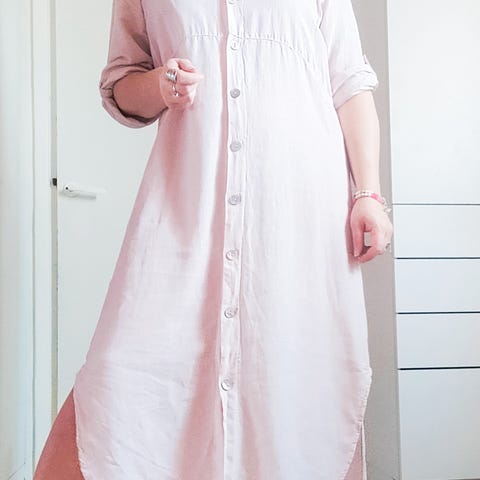 Nätti haalean beige pellavamekko noin kokoa noin L. Edessänapitus, hihoissa mahdollisuus säätää pituutta napeilla. Kivat taskut sivuilla. Täydellinen mekko töihin tai kotipuuhiin! Kangas on hyväkuntoinen, ei kuitenkaan aivan uudenkarhea. Kai-kai: 60cm, pituus olalta 119cm.